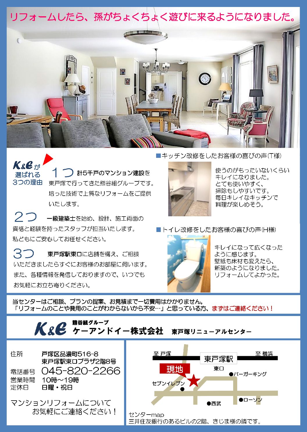 イベント情報 無料見積り・相談 電話で見積り・相談 0120-182-266 【受付】9:00~17:00【定休日】土日・祝日 ※土日は要予約 電話で見積り・相談 HOME最新情報最新情報もっと暮らしがラクになる!整理収納セミナー(終了しました) もっと暮らしがラクになる!整理収納セミナー(終了しました) 「年末の大掃除、どこから片付けて良いいいのか分からない…」「収納スペースが狭い…」「プロおすすめの収納グッズが知りたい!」という方におすすめの「もっと暮らしがラクになる!整理収納セミナー」を開催いたしました。沢山の方にご来場いただき、誠にありがとうございました。 最新情報一覧はこちら 最新情報一覧はこちら 弊社について 会社案内代表挨拶会社概要経営理念アクセスマップ 施工事例 施工事例一覧 予算1,000万~ 予算800万~ 予算500万~ 中古リフォーム フルリフォーム 水まわり交換 間取り変更 内装リフォーム その他 参考価格 リフォーム価格表 カテゴリーなし お客様の声 お客様の声一覧 おすすめコンテンツ お問い合わせ お問い合わせ ホーム / HOME 選ばれる理由 / REASON 会社案内 / COMPANY 会社案内代表挨拶会社概要経営理念アクセスマップ 施工事例 / WORKS 施工事例 一覧フルリフォーム間取り変更水まわり交換内装リフォーム お客様の声 / VOICE おすすめコンテンツ / CONTENTS 最新情報マンションリノベーション参考価格リフォーム LINE相談・見積もりリフォームの流れ★おしらせ★『仮住まい用住戸工事完成』東戸塚なんでも相談所-e暮らし隊- お問い合わせ / CONTACT Copyright © 2018 ケーアンドイー株式会社 リフォームセンター All Rights Reserved.