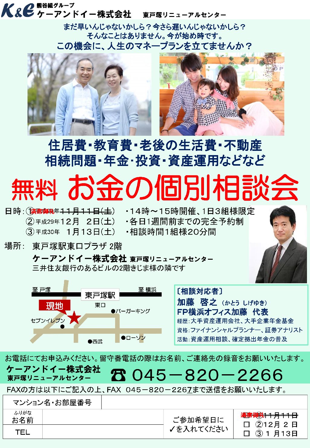 イベント情報 無料見積り・相談 電話で見積り・相談 0120-182-266 【受付】9:00~17:00【定休日】土日・祝日 ※土日は要予約 電話で見積り・相談 HOME最新情報最新情報お金の個別無料相談会 1/13(土)14:00~15:00(終了しました) お金の個別無料相談会 1/13(土)14:00~15:00(終了しました) 住居費、教育費、老後の生活費、不動産、相続問題、年金、投資、資産運用など、人生のマネープランについて「まだ早いんじゃないかしら?」「今更遅いんじゃないかしら?」とお悩みの方に、お金の個別相談会のご案内です。ファイナンシャルプランナー、証券アナリストの資格を持ったプロと、一対一でお金についてのお悩みを相談してみませんか?無料の相談会ですので、ぜひお気軽にお申込みくださいませ。 最新情報一覧はこちら 最新情報一覧はこちら 弊社について 会社案内代表挨拶会社概要経営理念アクセスマップ 施工事例 施工事例一覧 予算1,000万~ 予算800万~ 予算500万~ 中古リフォーム フルリフォーム 水まわり交換 間取り変更 内装リフォーム その他 参考価格 リフォーム価格表 カテゴリーなし お客様の声 お客様の声一覧 おすすめコンテンツ お問い合わせ お問い合わせ ホーム / HOME 選ばれる理由 / REASON 会社案内 / COMPANY 会社案内代表挨拶会社概要経営理念アクセスマップ 施工事例 / WORKS 施工事例 一覧フルリフォーム間取り変更水まわり交換内装リフォーム お客様の声 / VOICE おすすめコンテンツ / CONTENTS 最新情報マンションリノベーション参考価格リフォーム LINE相談・見積もりリフォームの流れ★おしらせ★『仮住まい用住戸工事完成』東戸塚なんでも相談所-e暮らし隊- お問い合わせ / CONTACT Copyright © 2018 ケーアンドイー株式会社 リフォームセンター All Rights Reserved.