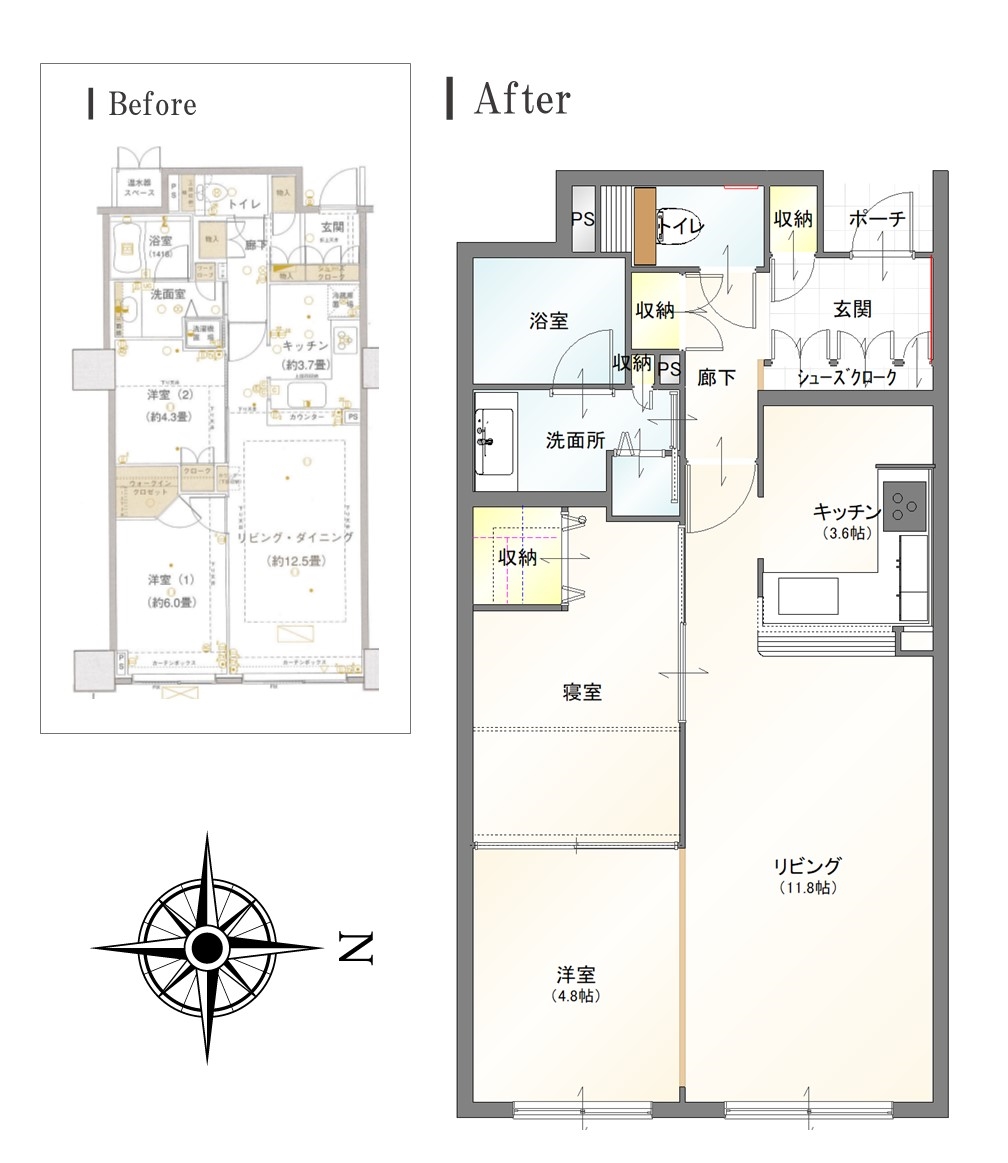 | 施工内容 | ・間仕切り変更 ・室内窓取付 ・和室の洋室化 ・床の張り替え ・クロスの張り替え ・鏡取付 他 |